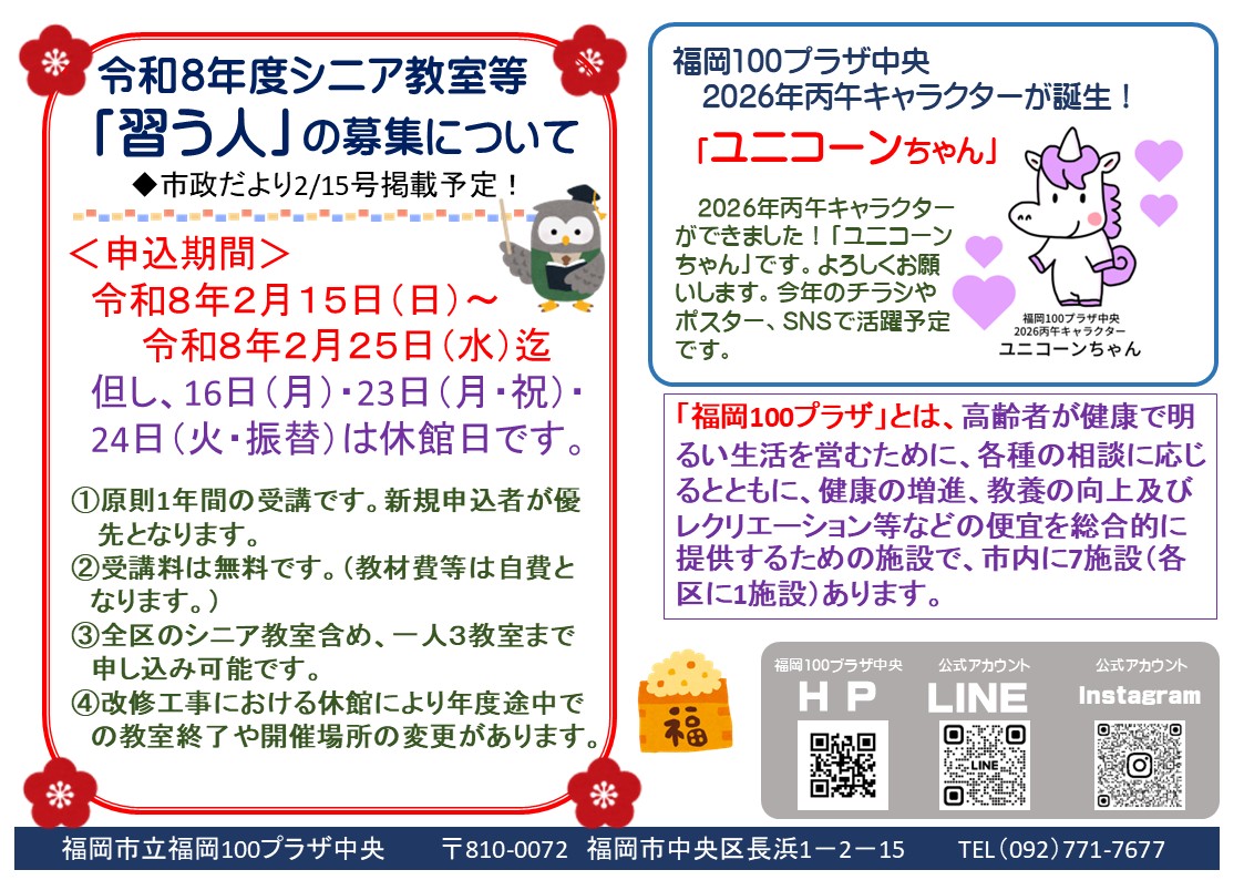 ■令和8年度シニア教室等開講教室(予定)のお知らせ 令和8年2月1日更新